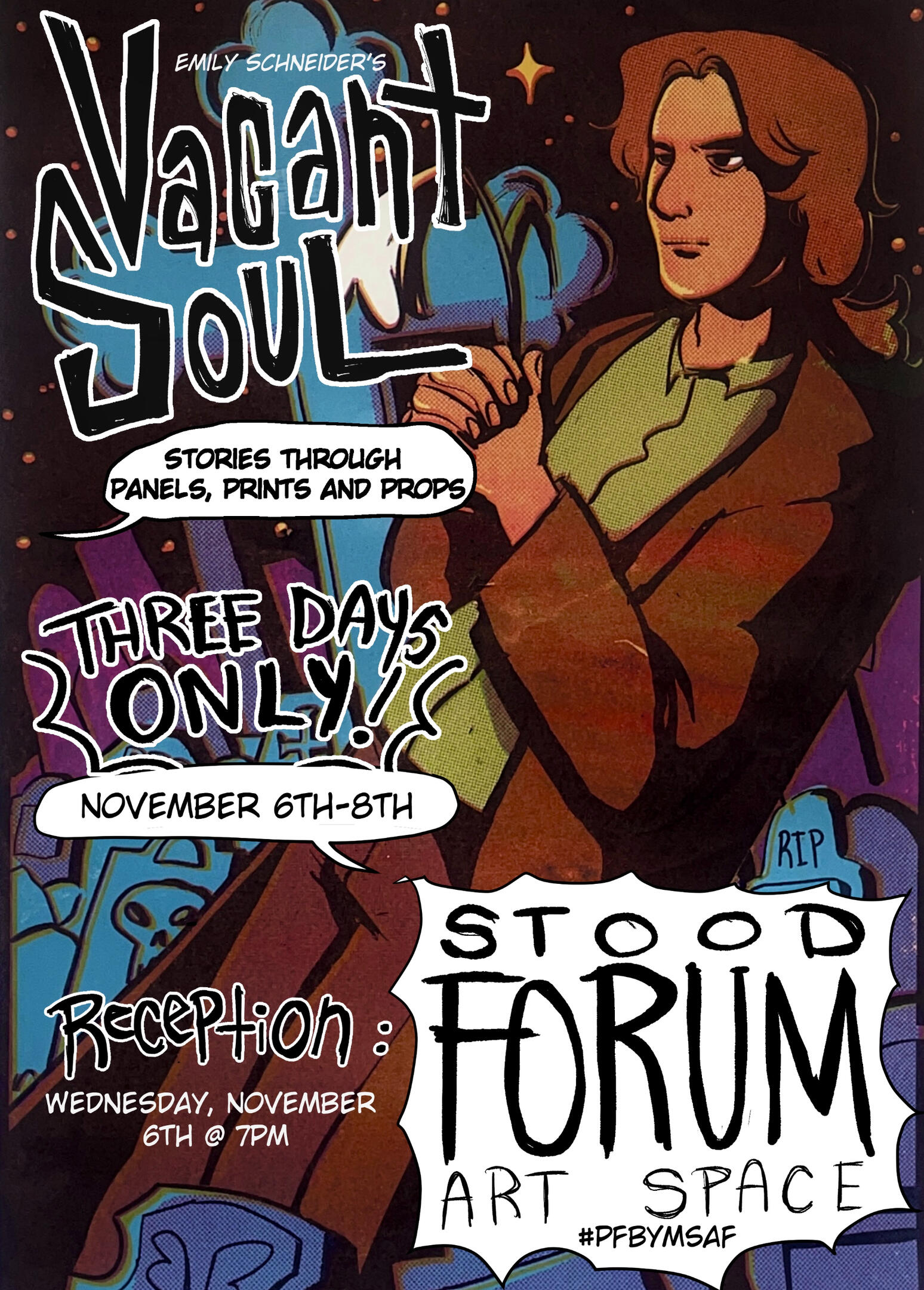 I like to dabble a little bit into everything, but work primarily in digital illustration. I am enamored by the silly and absurd and tell these stories through sequential works, programming, and animation. I am inspired by comics and narrative video games. A current, personal project I'm working on is a comic titled “Vacant Soul.”